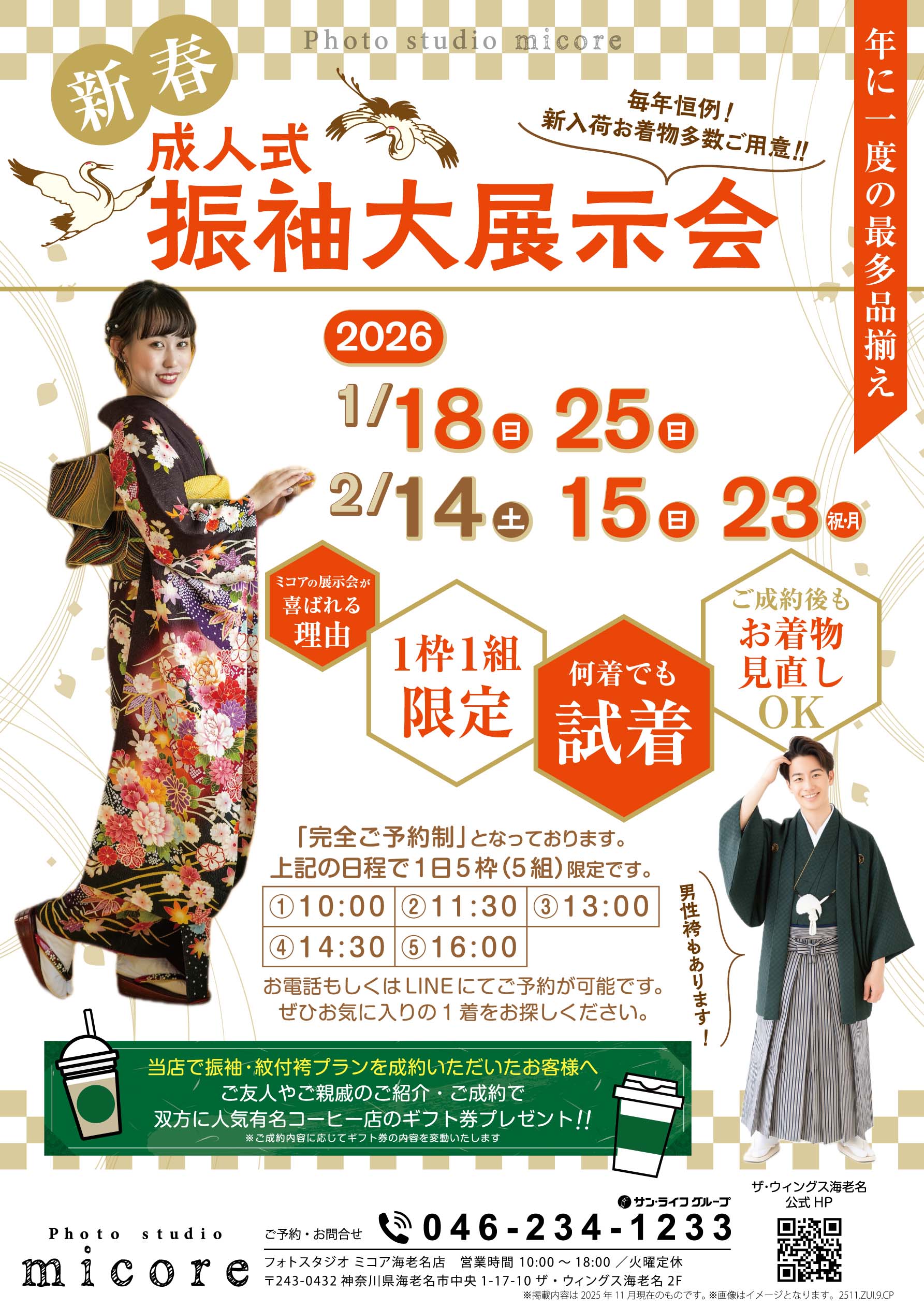 ザ・ウィングス海老名に1月グランドオープンするフォトスタジオ『ミコア』では、2027・28年に成人式を迎えられる皆さまを対象に「成人式 振袖大展示会」 を開催いたします。